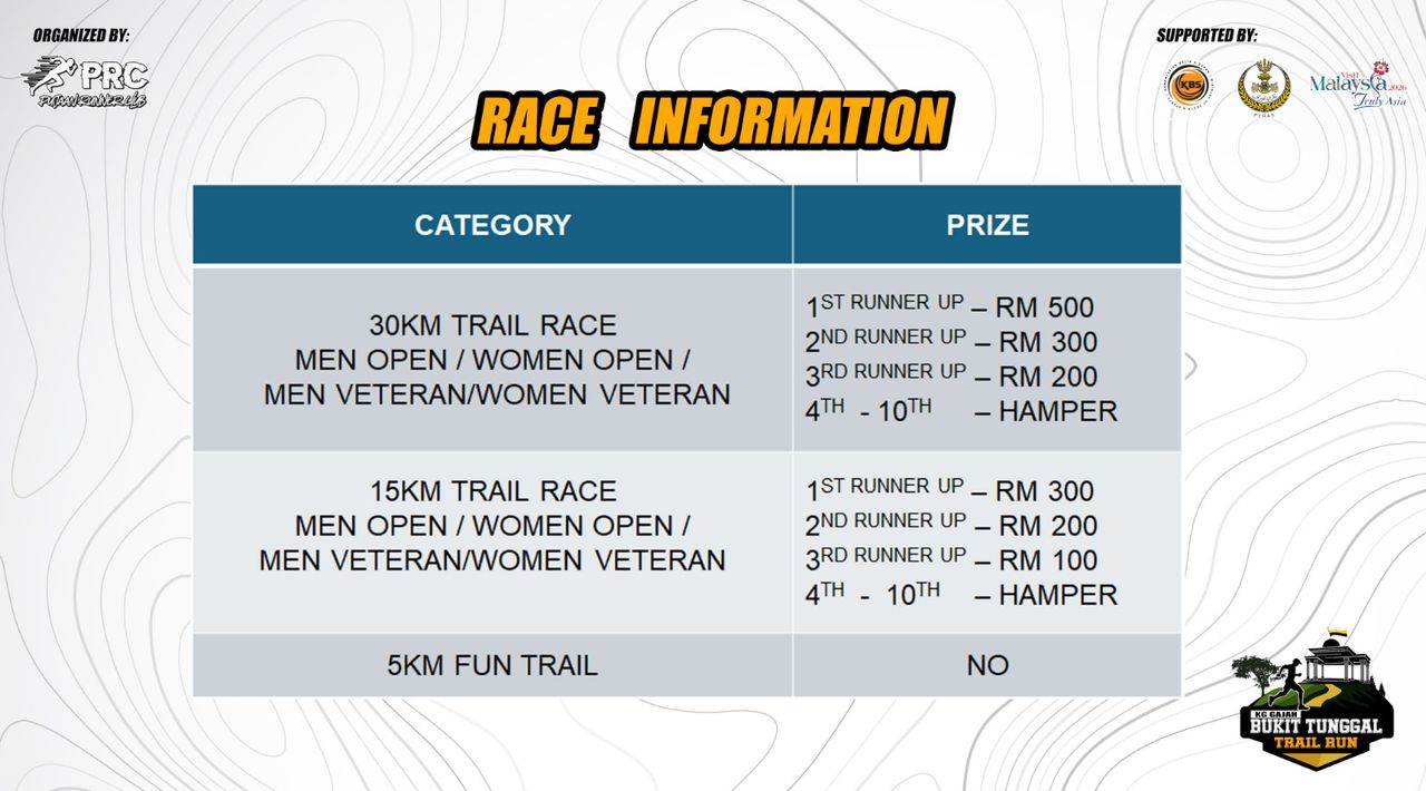 Category : 5KM Fun Trail / 15KM Trail Race / 30KM Trail Race