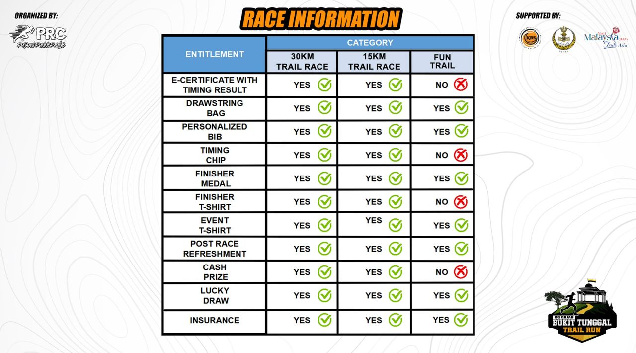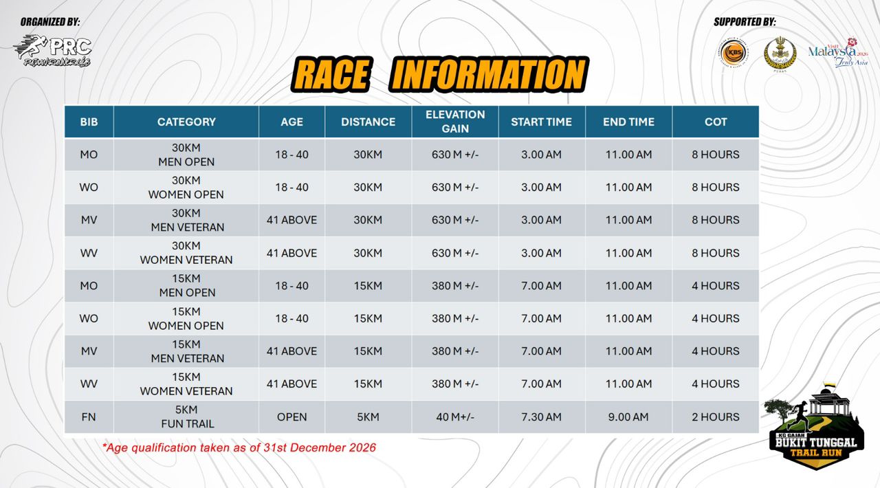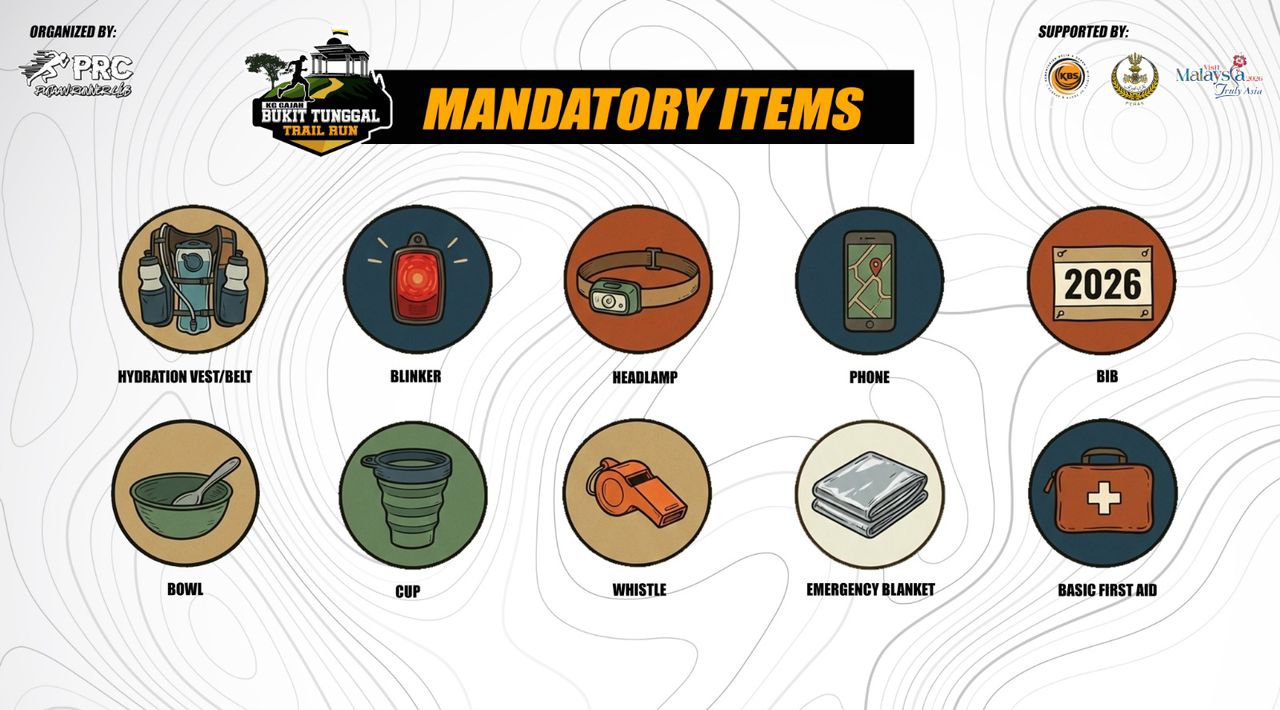 - There is no pre-requisite of completing any other trail running race to participate in BUKIT TUNGGAL TRAIL RUN 2026. It is participants responsibility to ensure you are physically fit to complete the distance you have registered, monitor your health during the race, including knowing when to withdraw from the race if you are no longer able to continue.
