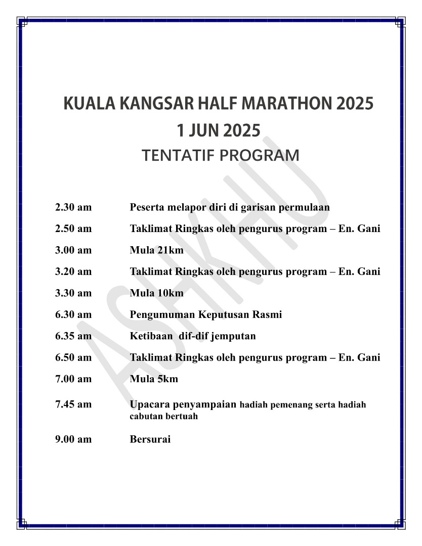 Kuala Kangsar Half Marathon 2025 kali kedua ini peringkat antarabangsa akan diadakan untuk memberi kepuasan kepada masyarakat tempatan sama-sama mengambil bahagian di dalam larian dan merancakkan lagi aktiviti kecergasan serta mengamalkan Gaya Hidup Sihat.
