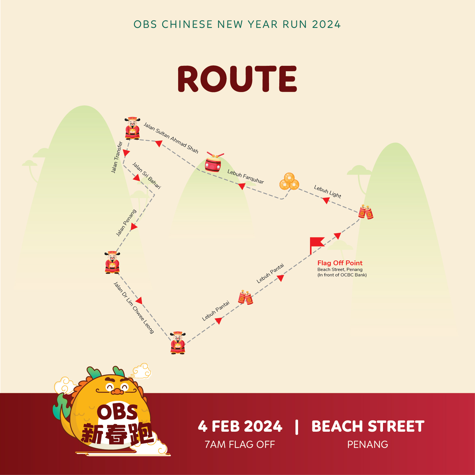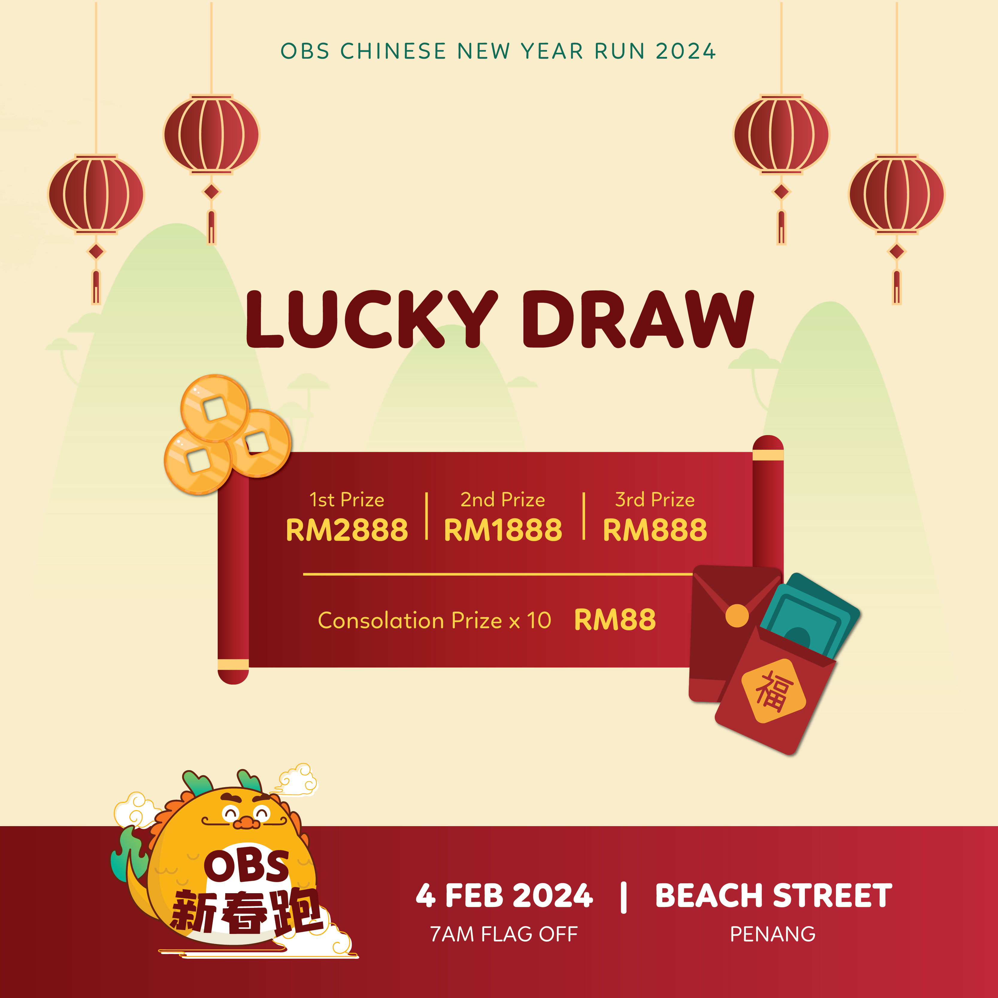 Chinese New Year mood on with us! The OBS CNY Run is back by popular demand on 4 February 2024! Immerse yourselves in the festive bright red spirit of Chinese New Year by participating in our popular 5km run across George Town World Heritage Site! Be sure to boost your excitement up - roam the streets and find high stilt lion dance, war drums performance as well as all forms of colourful celebration by pleasant surprise!
