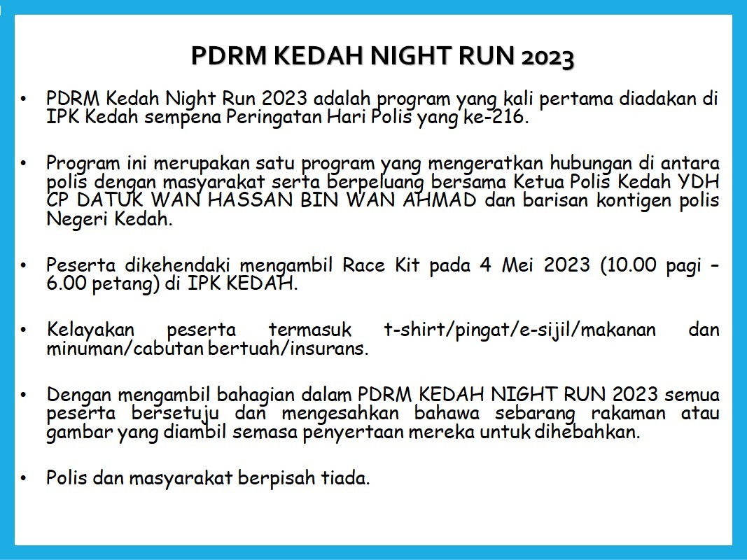 PDRM Kedah Night Run 2023 registration is now open and the closing date is on the 20th April 2023.