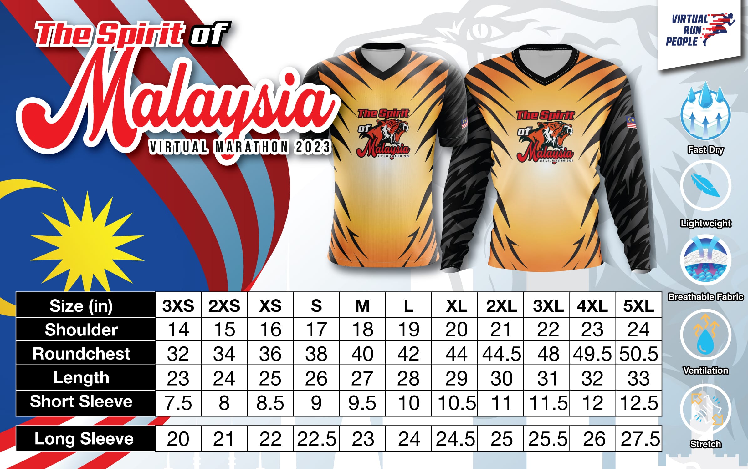 Spirit of Malaysia Virtual Marathon 2023 Dry-fit Finisher shirt (Distance Printed) (Option to upgrade from short sleeve to long sleeve T-Shirt for all categories - extra RM10)