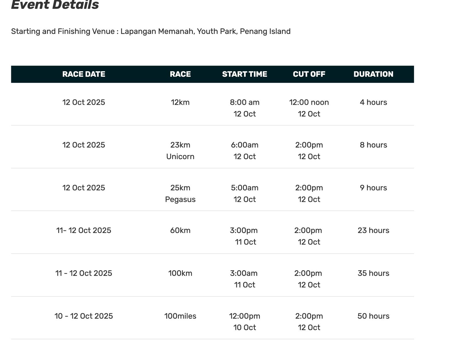 | Categories | 12km | 26km | 30km | 60km | 100km | 100 Miles | Great Trails of Penang 200KM |