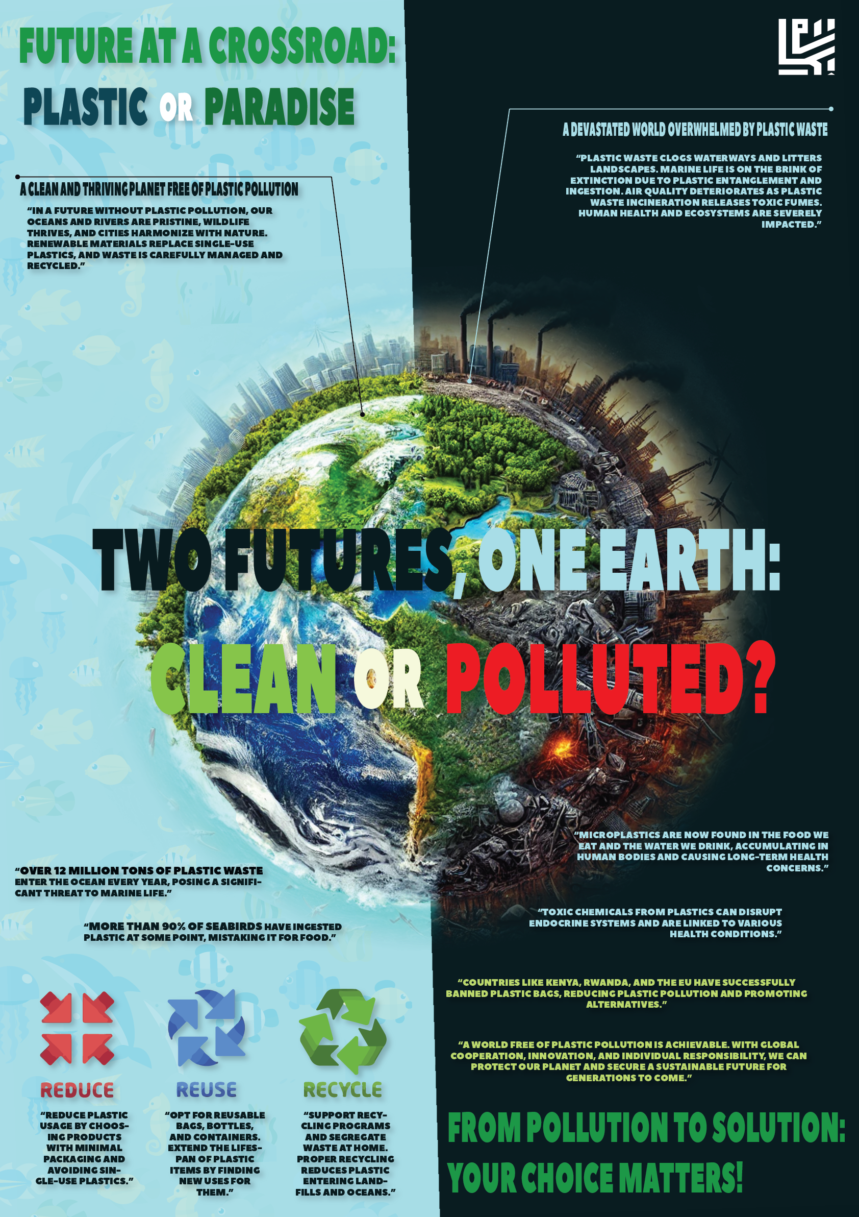 My poster contrasts a thriving, clean planet with a world destroyed by plastic pollution. Through this visual depiction, I aim to highlight the urgency of the choices we make today and their impact on our shared future.